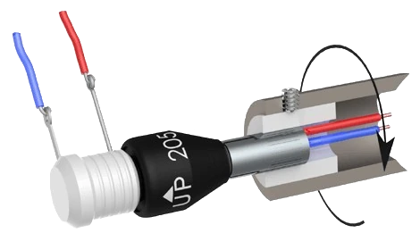 La tapa de plástico con terminales de soldadura se fija a cables estacionarios.
