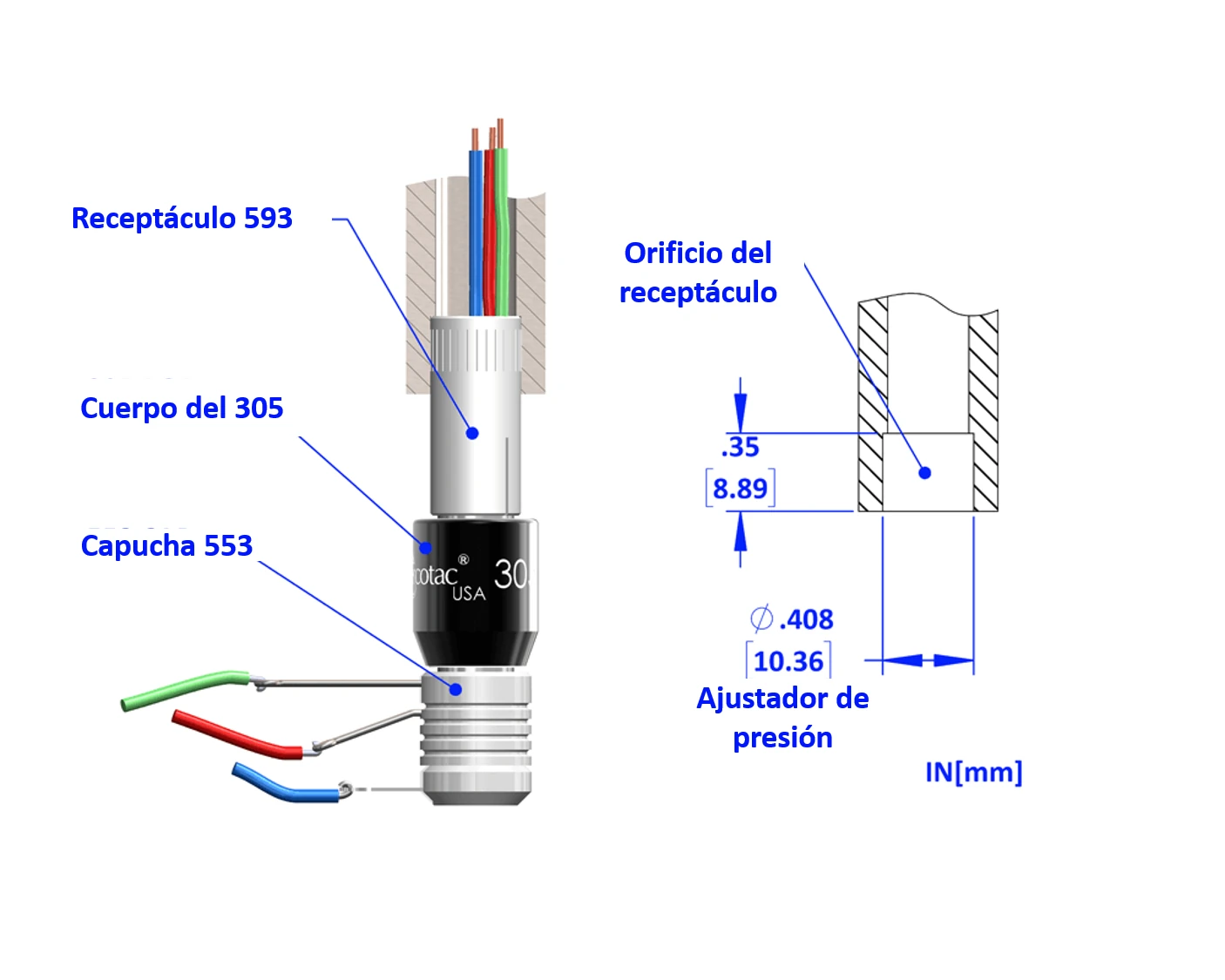 La tapa se conecta al extremo estacionario del 305 para conectar cables estacionarios.